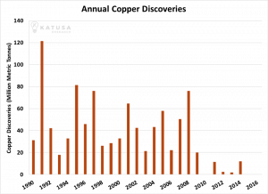 Fora isso, as descobertas no setor estão diminuindo drasticamente (vide gráfico abaixo), o que impactará o preço futuro da commodity. E os custos de novos descobrimentos também estão subindo, reduzindo o apelo para novas descobertas e induzindo o preço a uma alta.