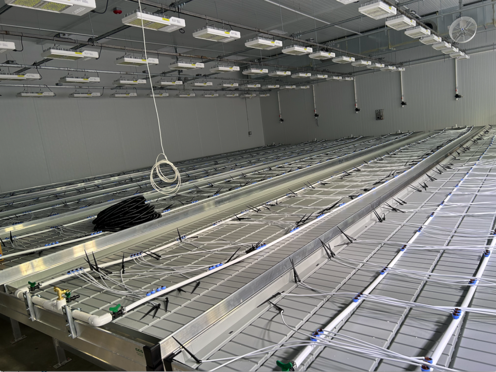 E eles sempre estão focados na redução de custos. Abaixo, uma foto da futura área de plantio em Nova Jersey, onde o custo do aluguel é superior ao do Oregon. Para otimizar recursos, as fileiras de plantas foram colocadas próximas umas das outras, mas com rodinhas embaixo, permitindo que sejam movidas para dar espaço a plantas maiores ou para facilitar a passagem dos trabalhadores.
