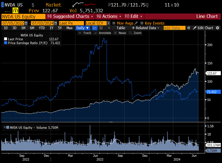 Em Nova Jersey, onde o preço da cannabis está em torno de US$ 3.500/lb, a empresa deve produzir aproximadamente 12 mil libras a partir do próximo ano. Mesmo que os custos operacionais aumentem em 20%, podemos projetar um EBITDA de pelo menos US$ 20 milhões. Esse salto na geração de caixa da empresa surpreenderá muita gente e destacará ainda mais a eficácia de sua estratégia de negócio. À medida que projetamos a expansão da Grown Rogue para mais estados e analisamos situações como as acima, torna-se evidente que a empresa está barata para investidores com visão de longo-prazo. A expectativa é que a geração de caixa aumente substancialmente a partir do próximo ano. Por incrível que pareça, pensamos na Nvidia para ilustrar uma comparação. Há pouco mais de um ano, o múltiplo preço/lucro da gigante de tecnologia estava acima de 220, levando muitos a considerarem as ações supervalorizadas. No entanto, alguns investidores já antecipavam um crescimento significativo dos lucros, o que resultaria na redução do múltiplo, conforme gráfico abaixo.