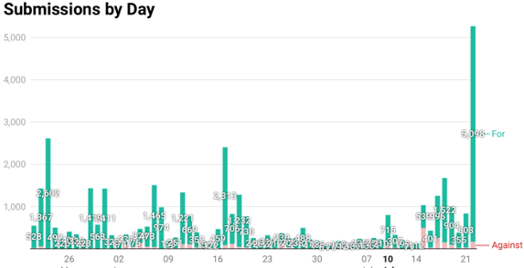 O número impressionante de engajamentos no tema superou todas as expectativas, estabelecendo um novo recorde. Para se ter uma ideia da magnitude do ocorrido, o segundo maior volume de comentários ocorreu em 2020, durante o debate sobre telemedicina, que atraiu cerca de 38 mil comentários. Esse fato destaca o quão importante o tema do reschedule da cannabis é para os americanos.