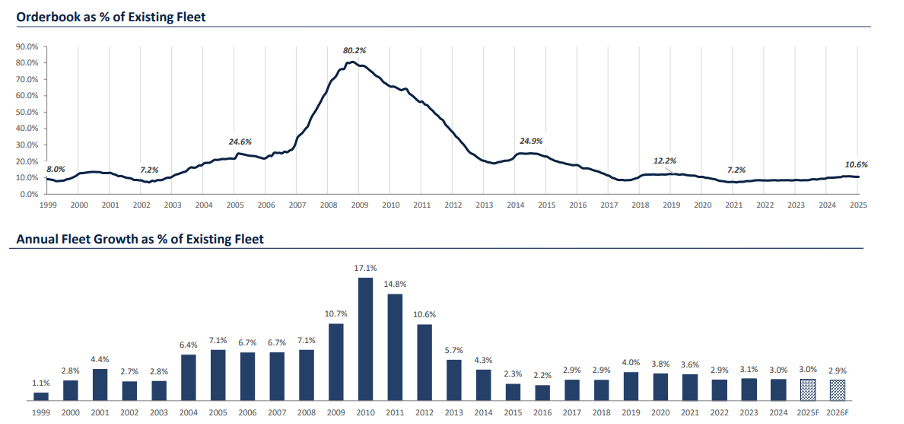 É importante destacar que o orderbook no atual patamar, superior a 10%, não significa que a frota crescerá 10% este ano, mas sim ao longo dos próximos anos. Dificilmente o crescimento será maior que 3% ao ano no futuro próximo. Enquanto isso, um quarto da frota tem mais de 15 anos, já que uma boa parte da composição atual foi entregue durante o último bull market. Em 2027, praticamente 50% da frota terá essa idade.