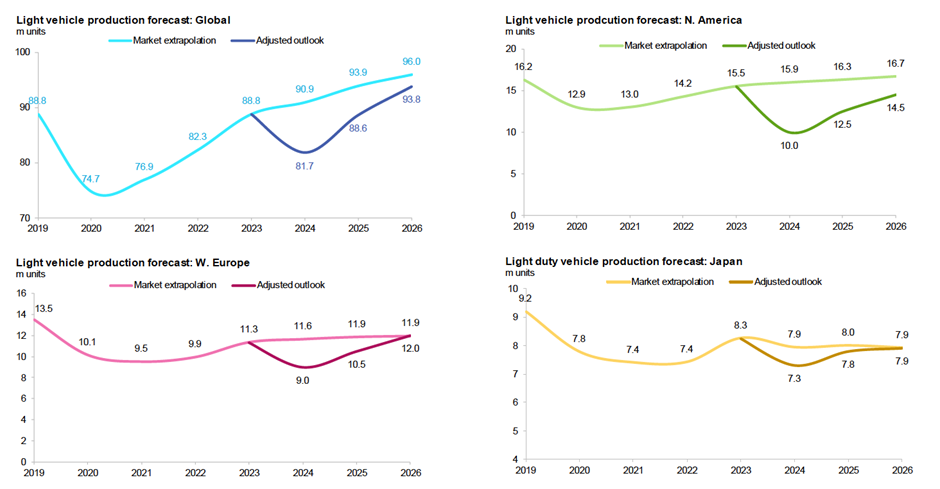 Atualmente, os EUA ocupam a posição de segundo maior mercado automobilístico do mundo, com aproximadamente 15 milhões de veículos vendidos no ano passado. Abaixo, apresentamos as projeções do mercado no que tange à produção de veículos na América do Norte, na Europa, no Japão e no agregado global.