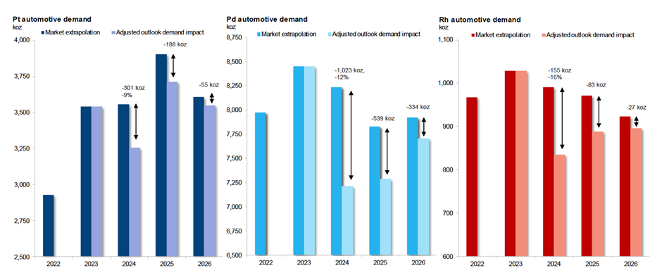 Observem que as expectativas ajustadas indicam uma queda acentuada na produção e venda de veículos, resultando em uma redução significativa no consumo de metais do grupo da platina (PGMs), conforme ilustrado no gráfico abaixo. No entanto, o declínio projetado não está se concretizando.